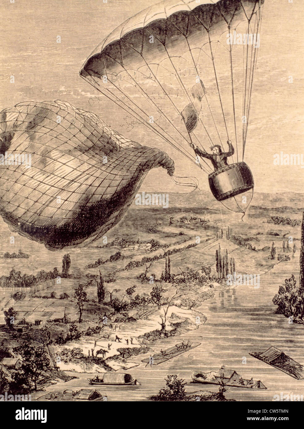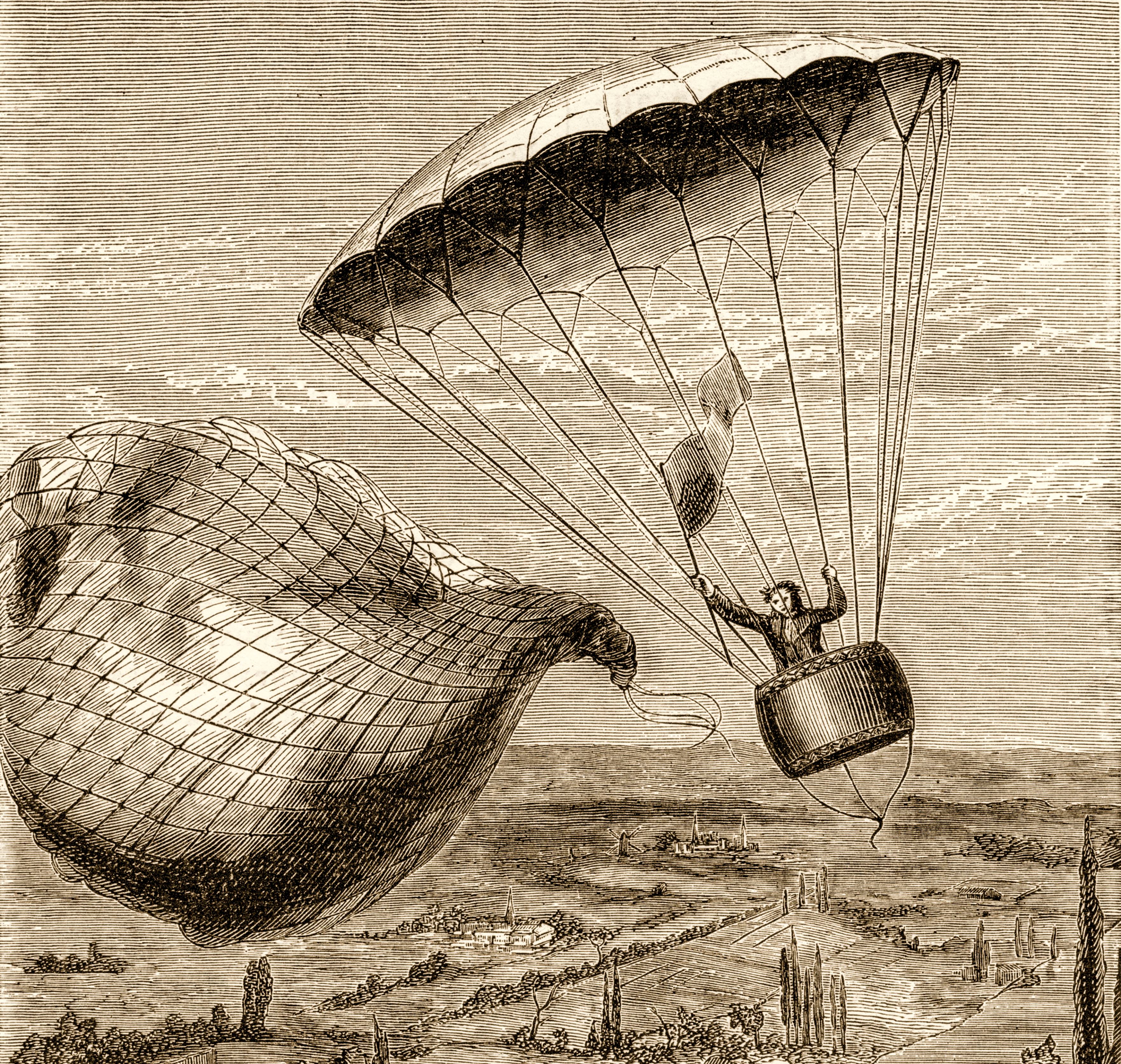 Parachute: History of the parachute - DiveScotty Louis-Sébastien Lenormand parachuted from a building in 1783; it was the first, modern, recorded parachute's jump . In 1785, a dog made the transition to aerial jumps when it parachuted from a hot-air balloon.