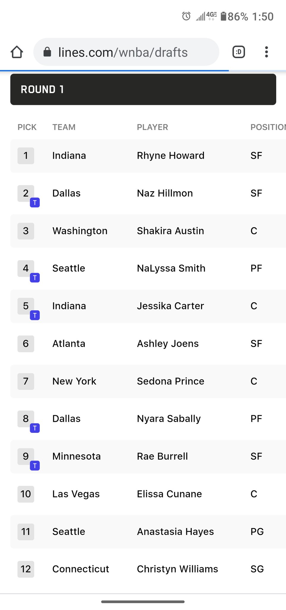 2022 WNBA Mock Draft | WNBA Draft Rounds - Lines.com 2022 WNBA mock draft . Draft date: April 11th 2022 @ 7:00 PM . Check out ... The Ohio State star could rise to WR1 in the 2022 NFL Draft class with a spectacular combine performance. Latest trades Indiana. Dallas. 2022-03-08. Round 1. Dallas. Indiana. 2022-03-08. Round 1. Los Angeles. Atlanta . 2022-02-05. Round 2. Seattle. Los Angeles. 2022-02-03. Round 1. Chicago. …