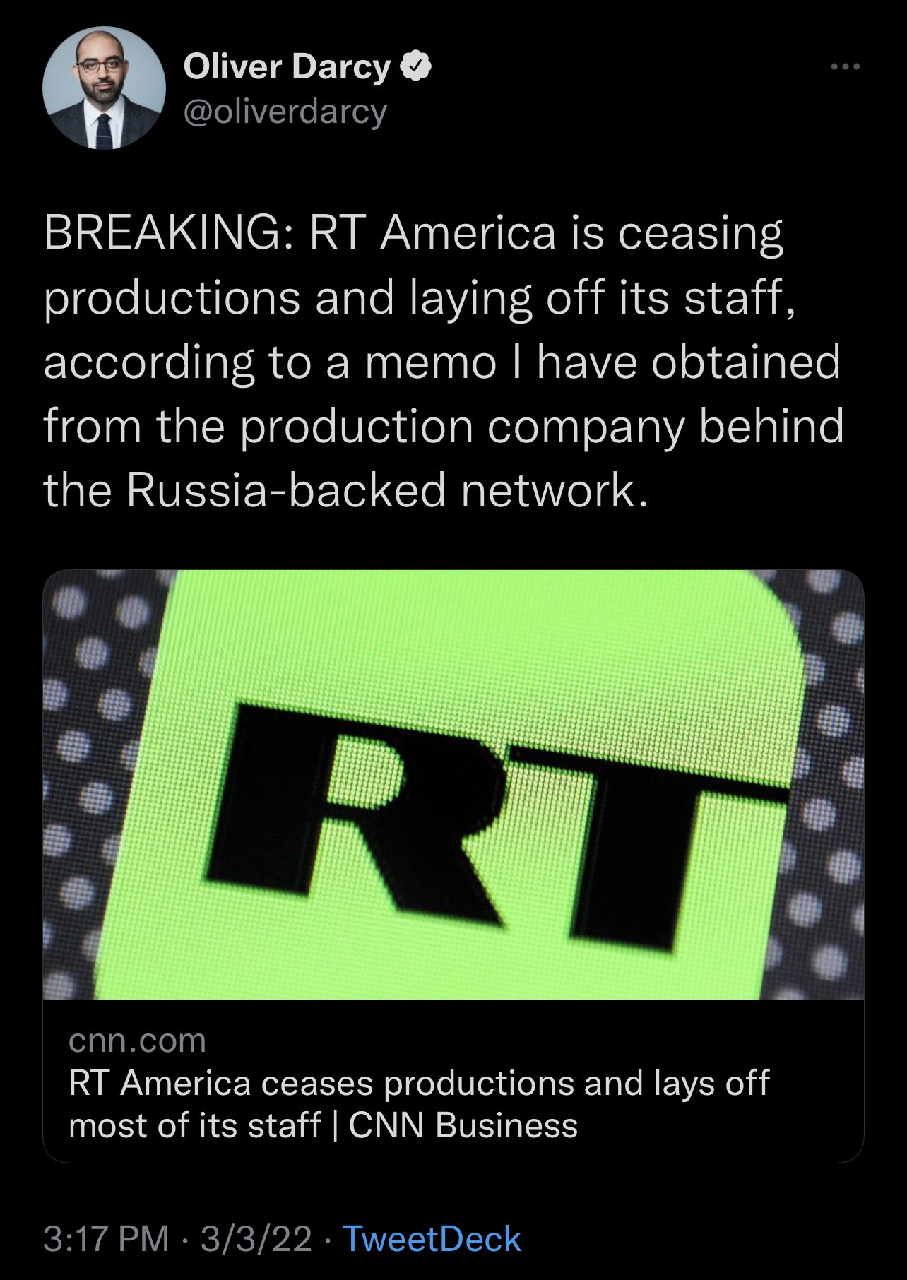 ktvz.com › money › cnn-business-consumerRT America ceases productions and lays off most of its staff ... Mar 03, 2022 · RT America will cease productions and lay off most of its staff, according to a memo CNN obtained from T&R Productions, the production company behind the Russian state-funded network.